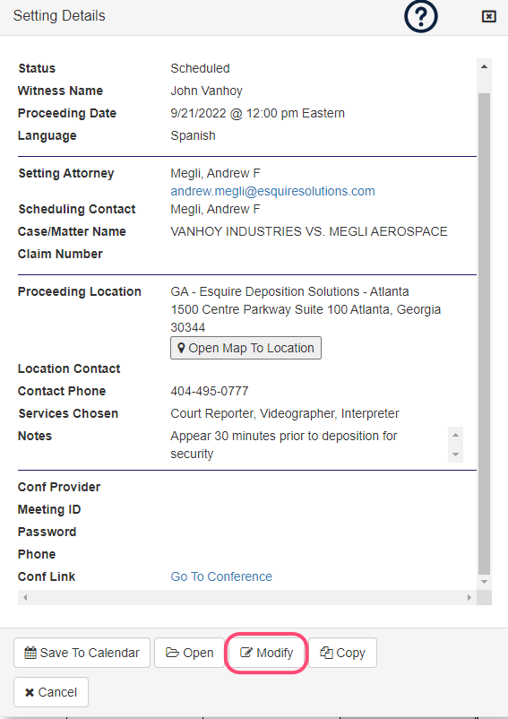 Any proceeding scheduled with Esquire Deposition Solutions can be rescheduled or otherwise changed (such as requested services) through EsquireConnect.